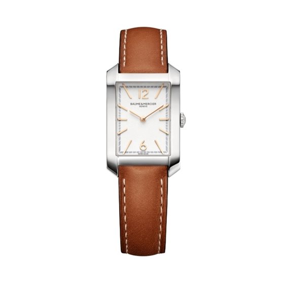 Questo classico orologio Hampton da donna presenta un elegante quadrante rettangolare argentato con raffinate lancette a forma di gladio dorate e cifre arabe dorate a ore 6 e a ore 12. È dotato di un cinturino in vitello marrone chiaro con impunture beige. Questo segnatempo da donna con movimento al quarzo è dotato di un vetro zaffiro bombato antigraffio e di una cassa in acciaio inossidabile con finitura lucida. Il cinturino in vitello, facilmente intercambiabile, offre a chi indossa l’orologio la libertà di trasformarne il look.