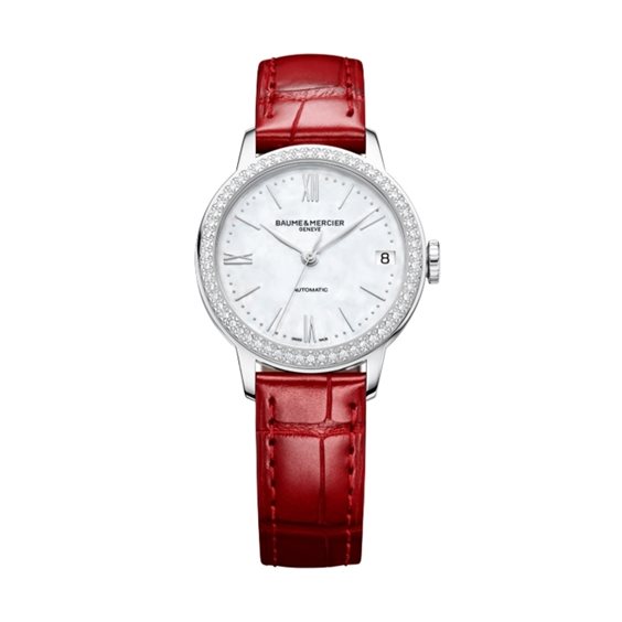 L’orologio con diamanti Classima M0A10546 e un cinturino rosso brillante trasuda eleganza e femminilità. Il quadrante in madreperla iridescente è circondato da 60 diamanti taglio brillante incastonati nella cassa in acciaio inossidabile con finitura lucida.