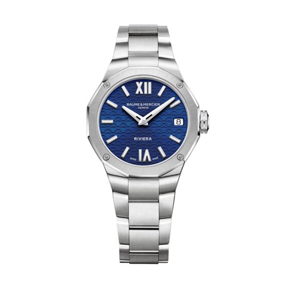 Riviera Lady 10727 Orologio al quarzo, Datario - 33 mm Animato da un movimento quarzo “Swiss Made”, questo Riviera è ornato da un quadrante blu e accompagnato da un bracciale in metallo che gli conferisce un look luminoso. Un segnatempo di carattere per una personalità decisa. Il blu del quadrante satinato soleil con motivo onde applicate trasparenti richiama il colore dei riflessi dell’acqua che, durante la giornata, sono scaldati dal sole. La data è indicata in un datario a finestrella a ore 3, mentre ore e minuti sono scanditi da cifre romane, indici rivettati con rivestimento in Superluminova (C1, a emissione blu) e lancette rodiate sfaccettate. Il tutto orchestrato da un movimento al quarzo con un’autonomia di 10 anni. In rilievo sulla corona ottagonale libera si trova il logo Phi, simbolo della Maison. Il segnatempo è impermeabile fino a 5 ATM (circa 50 m).