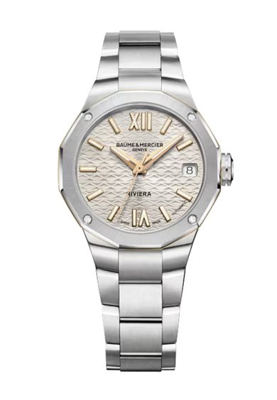 Animato da un movimento automatico “Swiss Made”, questo Riviera è ornato da un quadrante dorato e un anello dorato al centro della cassa con diamanti ed è accompagnato da un bracciale in metallo che gli conferisce un look luminoso. Un segnatempo di carattere per una personalità decisa.
