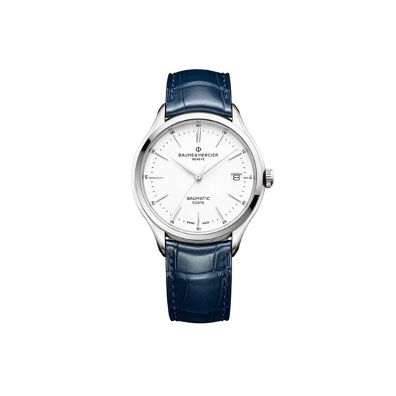 Clifton Baumatic OROLOGIO A CARICA AUTOMATICA Di sofisticata eleganza, il Clifton Baumatic da uomo è un orologio automatico con data e movimento meccanico a carica automatica.La sua estetica equilibrata accosta l’intramontabile cinturino in pelle di alligatore nera al quadrante bianco con indici di ore e minuti e la tipica finestrella della data a ore 3. La cassa in acciaio è completata dal fondello in vetro zaffiro trasparente che lascia ammirare il movimento automatico