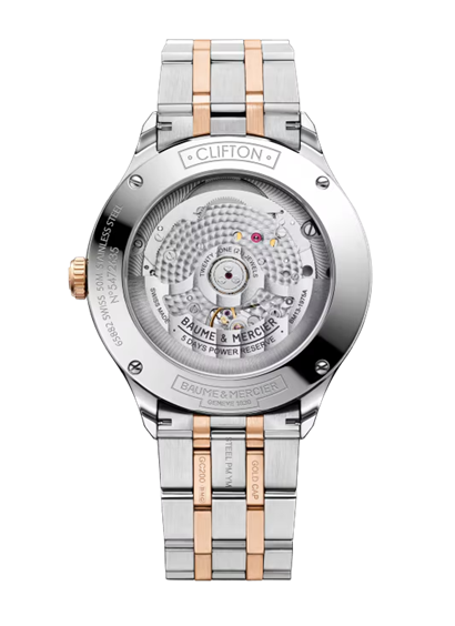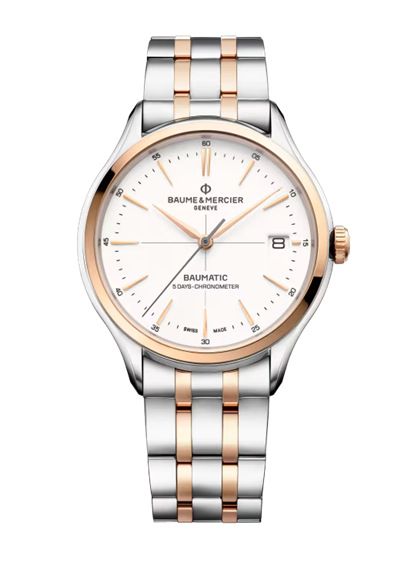 Animato dal movimento cronometrico certificato Baumatic, questo orologio ad alta precisione è dotato di una riserva di carica di 5 giorni. La cassa è realizzata in acciaio inossidabile con rivestimento in oro rosa 18 carati per un design equilibrato. Questo orologio bicolore ha un bracciale con finitura lucida-satinata e una chiusura tripla pieghevole. Il quadrante con finitura in porcellana bianco caldo è impreziosito da un mirino antracite al centro. La finestrella della data completa l’estetica classica di questo orologio a carica automatica.
