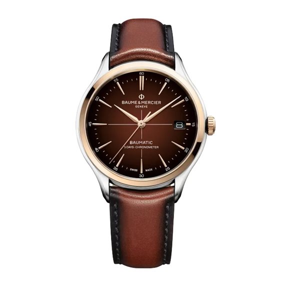 Animato dal prestigioso calibro di Manifattura Baumatic, questo modello raffinato da 40 mm con data declinato in calde tonalità offre tutta la precisione della tradizione orologiera svizzera. La profondità del quadrante sfumato color cioccolato è esaltata dal cinturino in pelle di vitello marrone effetto patina.