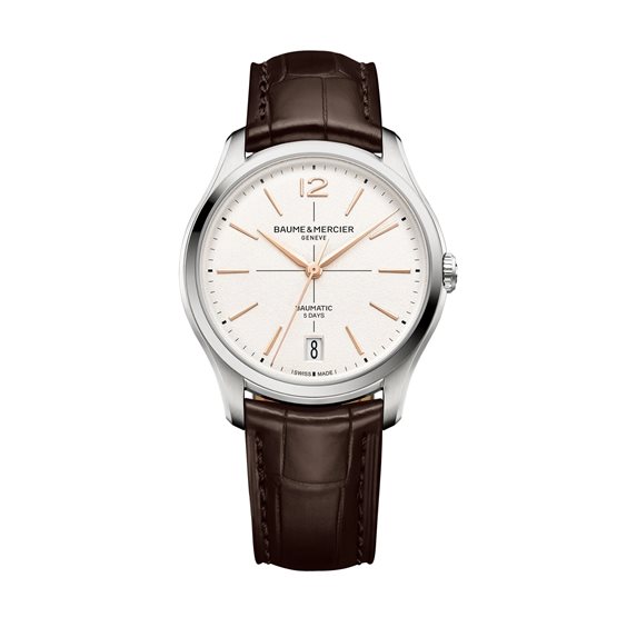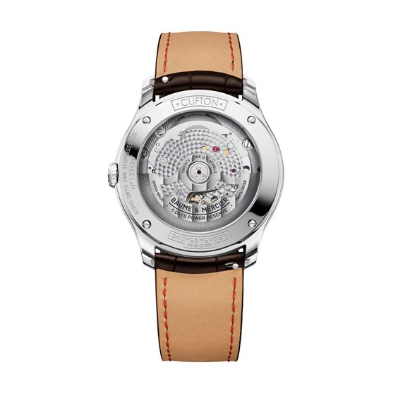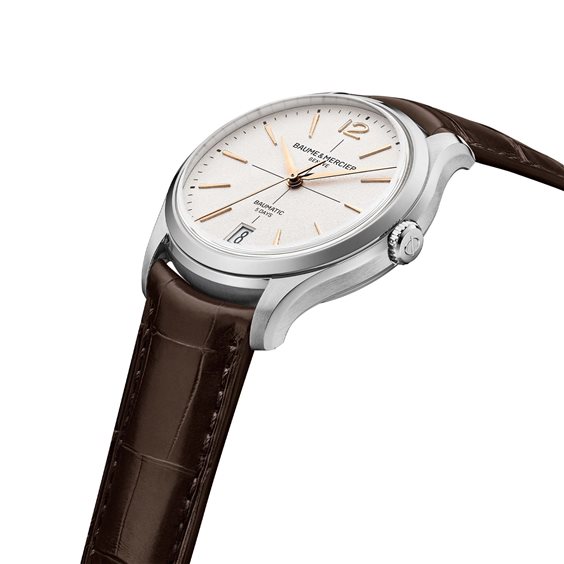 Il Clifton 10773 ha una cassa rotonda in acciaio inossidabile satinato e si aggiunge alla collezione in un formato di 39 mm. La cassa presenta una corona in acciaio e un fondello aperto in zaffiro. Il sottile quadrante bianco sporco con finitura granulata, orlato da una minuteria e da un mirino neri, mette in evidenza il numero arabo a ore 12, gli indici dorati e sfaccettati rivettati a forma di trapezio e le lancette a forma di alfa. È dotato di un movimento Baumatic a carica automatica (BM13-1975A) con riserva di carica di 5 giorni e impermeabilità fino a 5 ATM. Il cinturino intercambiabile in alligatore marrone è dotato di un affidabile sistema di sostituzione senza attrezzi.
