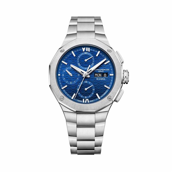Il cronografo Riviera 10826, ispirato alla versione da 43 mm, si aggiunge alla collezione in un formato più sottile da 41 mm. La cassa dodecagonale in acciaio inossidabile lucido e satinato è protetta da un vetro zaffiro antiriflesso. Il quadrante nero con motivo a onde, caratterizzato da un rehaut e da contatori azzurrati, mette in risalto i numeri romani, gli indici e le lancette rodiate con Superluminova bianco. È dotato di un movimento automatico con riserva di carica di 48 ore e impermeabilità fino a 10 ATM. Il bracciale intercambiabile in acciaio inossidabile è dotato di un sistema affidabile per la sostituzione senza attrezzi.
