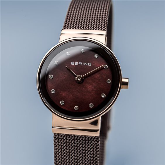 Orologio Solo Tempo Da Donna Di Bering Della Collezione Classic. Orologio Con Cassa Della Dimensione Di 22 Mm, Di Colore Oro Rosa Brillante E Realizzata In Acciaio Inox. Modello Con Cinturino Di Colore Marrone, Realizzato In Milano, Con Chiusura A Scatto. Questo Orologio Ha Quadrante Marrone In Madreperla, Con Vetro Zaffiro. La Finitura È Ip Oro Rosa. Modello Con Movimento Al Quarzo E Resistenza All'Acqua Di 3 Atm. Caratteristiche Aggiuntive: Pietre Swarovski, 3 Anni Di Garanzia. La Referenza È 10122-265 Questo solo tempo verrà spedito con Scatola Originale Bering