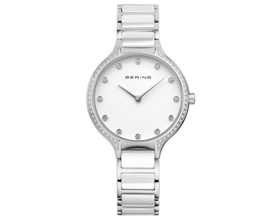 Orologio Bering da donna con movimento al quarzo. Cassa (34 mm) in acciaio inossidabile 316L con zirconi sulla lunetta. Bracciale in acciaio 316L con elementi in ceramica bianca. Chiusura a farfalla. Quadrante di colore bianco con zirconi agli indici. Vetro zaffiro piatto antigraffio. Impermeabilità: 3 bar. Garanzia internazionale prolungata di 3 anni.