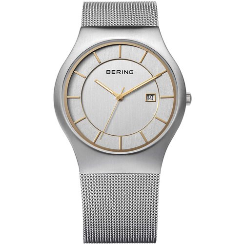 Cassa in acciaio diametro mm.38, vetro zaffiro, movimento al quarzo con datario, quadrante con indici laminati oro giallo, bracciale maglia Milano con fibbia regolabile, impermeabilità 5 atm., garanzia 3 anni.