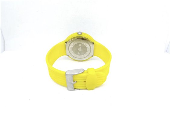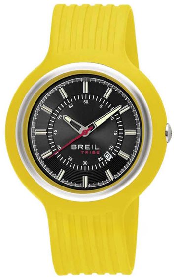 Orologio Breil collezione HIP HOP cassa in acciaio rivestita di silicone giallo mm 45, sfondo nero con indici e lancette luminescenti al buio, datario e cinturino in silicone giallo cm 23.5 max. Corona a pressione e fondo a viti, WR 5 atm.