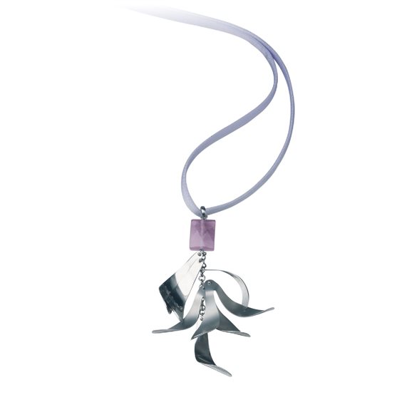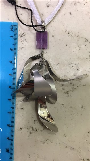 collana con filo in tessuto con pendente in acciaio e pietra dura viola.