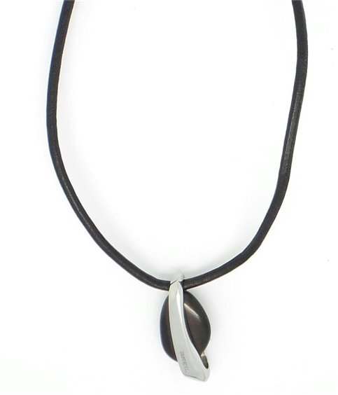 Girocollo da uomo in cordone cerato nero mm. ø 2.02, annodato e regolabile, pendente in acciaio lucido e acciaio satinato, misura mm. 25x12 con logo Breil a lato inciso a laser, trattamento IP. Lunghezza massima cm 70.