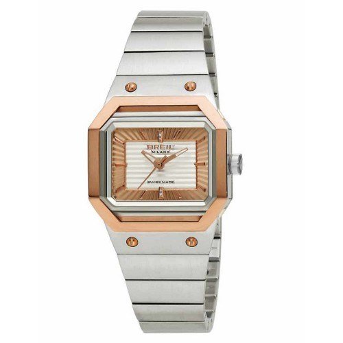 Orologio Breil Milano al quarzo donna. Cassa in acciaio lucido con inserti colore ramato mm 32. Corona a vite e fondo WR 10 atm chiuso con 4 viti. Cinturino in acciaio con chiusura deploiante a scomparsa. Quadrante a righe oro rosa e argentato centrale con 4 brillantini totali a ore 12 e 6.