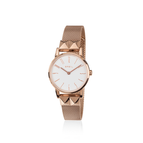Movimento al quarzo Miyota 2025 Cassa in acciaio IP rose 32mm Quadrante bianco Sfere IP rose Vetro minerale W.R. 5 atm Bracciale in acciaio IP rose maglia milanese Chiusura a scorrimento.