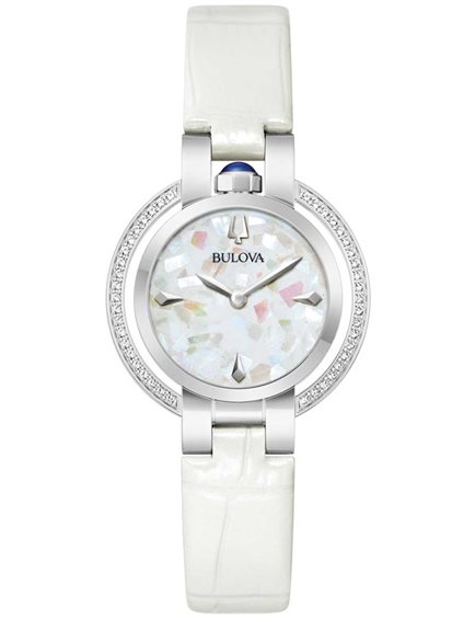 Orologio Bulova Donna Rubayat, edizione speciale 150th Anniversary. Rubaiyat è il primo orologio Bulova dedicato al polso femminile. Il nome Rubaiyat, voluto da J.Bulova, trae le sue radici dalla figura poetica della Dea del Tempo, da cui deriva l’incisione dell’immagine sul fondello dell’orologio. Bulova celebra i suoi 150 anni rieditando Rubaiyat in 4 versioni ispirate ai colori delle 4 stagioni. Questo orologio è ispirato all'inverno, con un quadrante in madreperla a mosaico che ricorda il ghiaccio. La cassa dalla finitura lucida è realizzata in acciaio. La lunetta esterna è decorata con zaffiri bianchi. La corona presenta un cabochon di Spiniello sintetico alle ore 12.