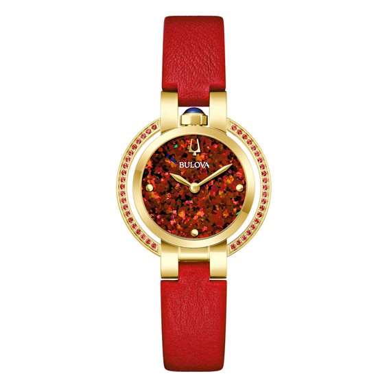 Orologio Bulova Donna Rubayat, edizione speciale 150th Anniversary. Rubaiyat è il primo orologio Bulova dedicato al polso femminile. Il nome Rubaiyat, voluto da J.Bulova, trae le sue radici dalla figura poetica della Dea del Tempo, da cui deriva l’incisione dell’immagine sul fondello dell’orologio. Bulova celebra i suoi 150 anni rieditando Rubaiyat in 4 versioni ispirate ai colori delle 4 stagioni. Questo orologio è ispirato all'autunno, con un quadrante in Opale di fuoco sintetico che ricorda il rosso delle foglie autunnali. La cassa dalla finitura lucida è realizzata in acciaio pvd oro giallo. La lunetta esterna è decorata con rubini. La corona presenta un cabochon di Spiniello sintetico alle ore 12.