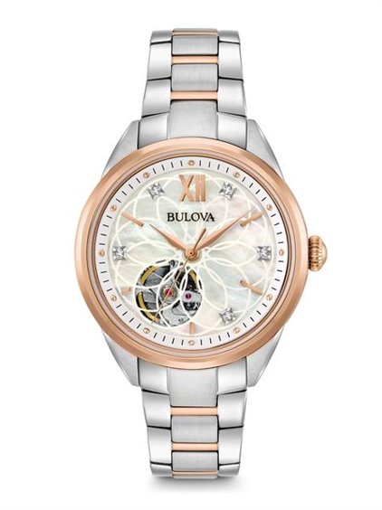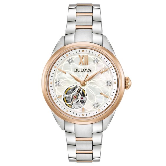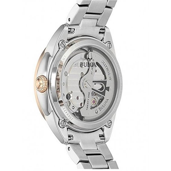 Orologio Automatico in acciaio inossidabile e oro rosa accenti con 5 diamanti singolarmente a mano su bianco quadrante di madreperla con oblò trasparente con movimento a vista, movimento automatico battito cardiaco con riserva di carica di 40 ore, vetro zaffiro a cupola, braccialetto in oro rosa e acciaio inossidabile con chiusura a doppia pressione e resistenza all'acqua a 30 metri.