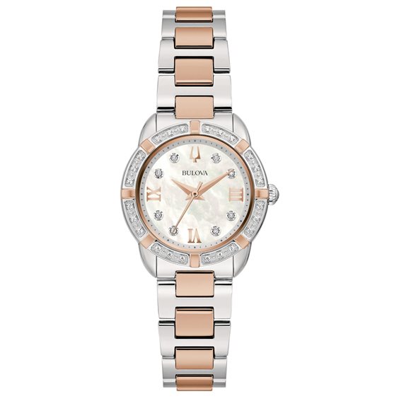Orologio da donna marca Bulova, diametro cassa 27 mm, cassa in acciaio con ghiera incassata con diamanti, quadrante in madreperla con indici applicati con diamanti, sfere e numeri applicati con finitura oro rosa, cinturino bicolore con finitura laminato oro rosa, chiusura deployante, water resistant 3 atm.