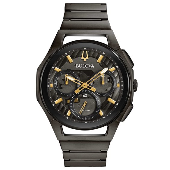 Orologio Bulova Uomo Crono Curv con indici dorati e vetro zaffiro. Fondello con movimento a vista. Chiusura deployante.