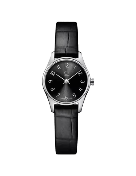 Orologio donna Calvin Klein, cassa in acciaio da 25 (diametro) x 30 mm (lug to lug), vetro minerale e cinturino in pelle nero stampa cocco. Quadrante nero con numeri. Movimento al quarzo Swiss Made. Water resistant 3bar.