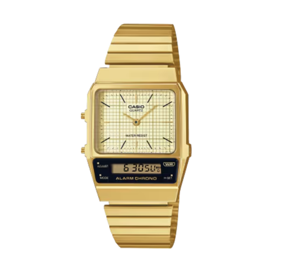 Rinnova il tuo stile retrò vintage con la modernità del design AQ-450 degli anni '80. Questo nuovissimo orologio in stile vintage unisce un look retrò con un tocco di eleganza. Un quadrante e un display LCD separati offrono eleganza analogica e prestazioni digitali. La lieve angolazione del display LCD segue le linee delle alette, mentre il quadrante analogico presenta semplici indici a barre. Il quadrante dell'orologio decorato con un motivo a griglia aggiunge il tocco finale per un look retrò. La combinazione della cassa angolare e dei collegamenti rettilinei del cinturino metallico è una celebrazione semplice ed elegante della bellezza strutturale. Oltre a un semplice look di tendenza, questi orologi offrono funzioni pratiche come secondo fuso orario, cronometro e promemoria sonoro, nonché caratteristiche di impermeabilità per l'uso quotidiano in totale tranquillità, anche nelle giornate piovose.