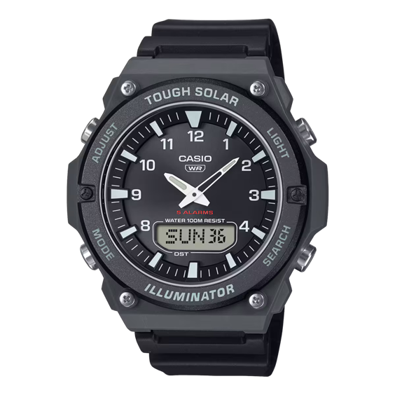 Un orologio a energia solare, resistente all'acqua per 100 metri, ispirato al design dei pannelli degli strumenti degli aerei. La lunetta rotonda e piatta è abbinata a indici e lancette dell'orologio di colore bianco per una visibilità di facile lettura. Il pratico LCD a ore 6 visualizza la data, il giorno e l'ora mondiale.
