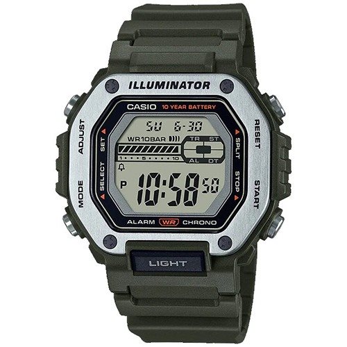 Oltre a una resistenza all'acqua fino a 10 bar e una batteria che dura 10 anni, questi orologi digitali presentano una lunetta in metallo dal design angolare e accattivante. Il quadrante oversize, facile da leggere e da usare è incorniciato dal look audace e solido dell'acciaio inossidabile. Il pulsante anteriore nella posizione dell'indicazione delle 6 consente di accedere facilmente alla luce LED. È inoltre dotato di altre funzioni pratiche, come cronometro, timer per conto alla rovescia, sveglia e doppio fuso orario.