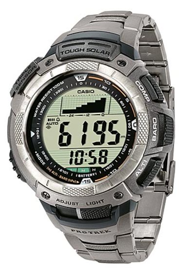 Multifunzione con cassa e bracciale in titanio. Cronometro a 1/100s fino a 10 ore, “World Time” per 30 città e count- down con ripetizione automatica. Calendario automatico fino al 2099. Termometro, barometro, altimetro fino a 10.000m, con differenziale di altitudine. Bussola digitale per 16 direzioni. 5 allarmi giornalieri. Batteria a ricarica solare, Duplex LCD sistema esclusivo per visualizzazi