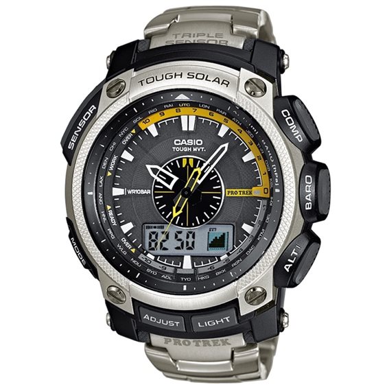 OROLOGIO UOMO CASIO PRW-5000T-7ER è un orologio maschile che sfrutta il movimento al quarzo ed ha un quadrante digitale analogico lcd Il cinturino è in titanio, la cassa in resina, e la chiusura è con doppio fermo di sicurezza, vetro minerale. Tra le tante funzioni di OROLOGIO UOMO CASIO PRW-5000T-7ER ci sono la funzione solare, la ricezione del segnale radio, la bussola digitale, la rilevazione dell'altitudine fino a 10000 mt, il barometro, termometro, timer, calendario, cronometro, indicatore del livello di batteria. Insomma, OROLOGIO UOMO CASIO PRW-5000T-7ER è sicuramente uno degli orologi da uomo Casio più completi. Dimensioni: ca. 56,80mm x 49,30mm x 14,30mm (A x L x P). Peso: ca. 110,00 g