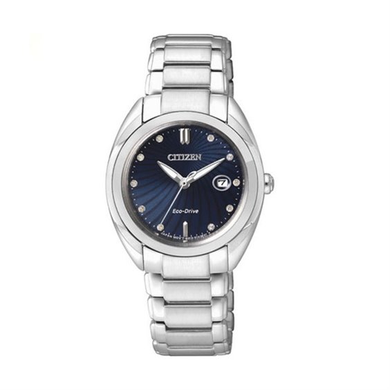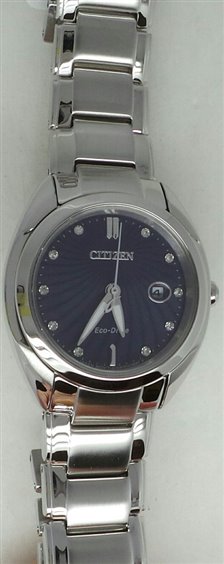Elegante e sportivo questo orologio della collezione Lady di Citizen, presenta 10 diamanti certificati sul quadrante, lancette luminose al buio, finestrella datario a ore tre; Vetro zaffiro antigraffio, apertura del bracciale a pulsante. Movimeto al quarzo Eco-Drive a carica luce con riserva di carica di 6 mesi. Peso 88 gr, spessore 8mm.