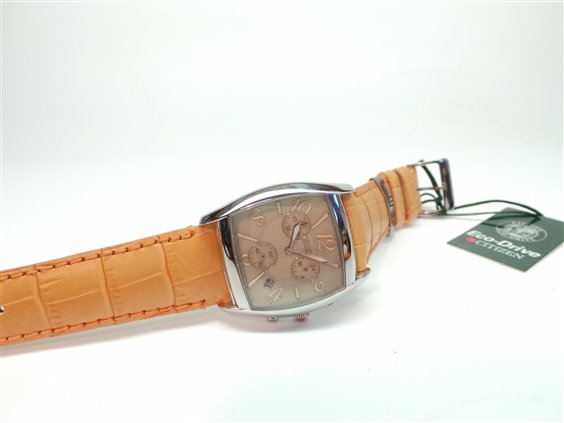 OROLOGIO DALLE FORME MORBIDE DONNA CRONOGRAFO ECODRIVE, NUMERI ARABI LUMINESCENTI AL BUIO ASSIEME A DELLE LANCETTE LO CONTRADDISTINGUONO PERCHE' CREATO DA DESIGNER ITALIANI. IL NOSTRO CONSIGLIO LO METTE AI VERTICI PER BELLEZZA E QUALITA', UN OROLOGIO FATTO PER FARSI GUARDARE DALLE EMOZIONI DECISE.
