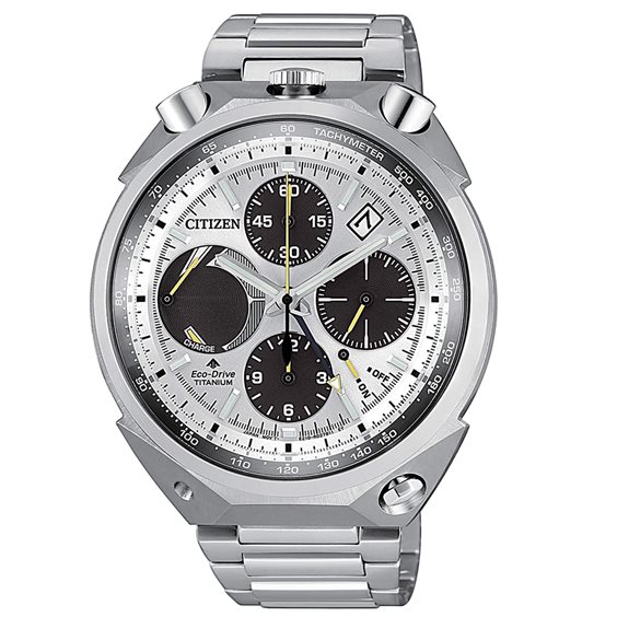 Orologio Citizen Chrono Bullhead edizione speciale per i 50 anni dell'uso del titanio sugli orologi da parte di Citizen, bracciale e cassa in super titanio, chrono flyback, vetro zaffiro indicazione della riseva di carica e quadrante bianco con contatori neri 'panda' dimensioni contenute diametro 43 mm