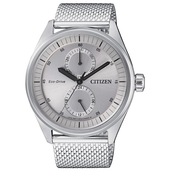 Orologio multifunzione. Cassa in acciaio lucido e spazzolato con fondo serrato a vite, ansa 22 mm. Movimento Eco-Drive a carica luce con riserva di carica 180 giorni. Vetro minerale. Quadrante colore acciaio, lancette nere e luminose, contatori giorno e data. Bracciale regolabile in acciaio, modello maglia milanese.