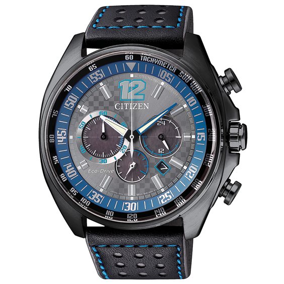 Orologio cronografo. Cassa in acciaio spazzolato e lucido con trattamento in PVD nero, fondo serrato a vite, ansa 24 mm. Movimento Eco-Drive a carica luce con riserva di carica a 270 giorni. Cronografo a 15 di sec. fino a 60 minuti. Vetro minerale. Quadrante colore grigio 'quadrettato' effetto fibra di carbonio, lancette e index luminose. Cinturino in pelle opaca nera e grigia con cucitura blu.