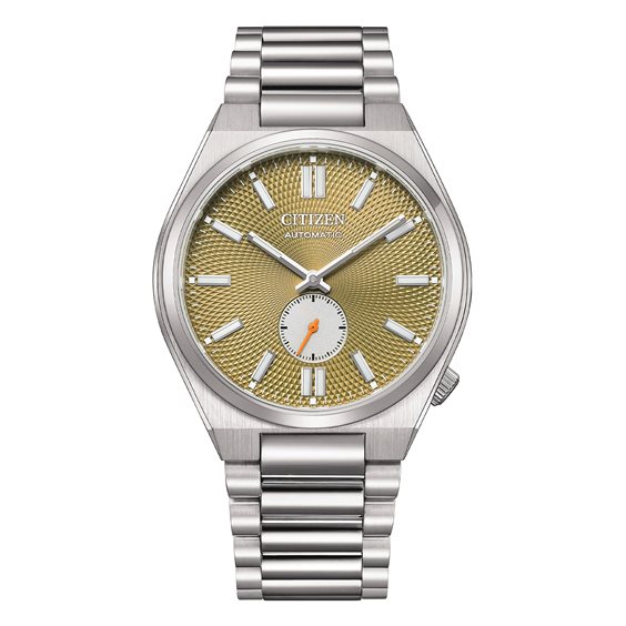 Orologio Automatico solo tempo Uomo Citizen modello Tsuyosa piccoli secondi. Cassa acciaio lucido e satinato fondo a vite con vista movimento, corona posizionata a ore 4. Nuovo Movimento Meccanico Automatico Citizen 21 rubini , 21.600 oscillazioni all'ora , riserva di carica 40 ore. Vetro Zaffiro antigraffio. Quadrante colore marrone con lavorazione guilloché indici e lancette luminescenti lancetta piccoli secondi arancio a ore sei. Bracciale in acciaio regolabile con chiusura deployante con pulsanti. Impermeabile 5 atm. Scatola e Garanzia 5 anni originali.