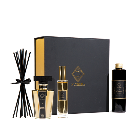 FRAGRANZA: AENIGMA - Un raffinato Cofanetto Regalo nero e oro, in Special Edition con le Legendary Fragrances DANHERA, racchiude l’Arte del Profumo e la magia del Dono. Ogni fragranza è un racconto da regalare, condividere, rivivere: un soffio che rende più belle le Atmosfere, una carezza che resta sulle superfici della memoria. Gold Treasure celebra gli amanti dell’arredo olfattivo con un gesto pensato per sorprendere, emozionare, durare: la bellezza che risplende, l’oro che custodisce, l’essenza che diventa stile. Il Cofanetto TRIO contiene: Decanter Impero GOLD mini 125 ml, Refill 250 ml, Natural Spray 50 ml