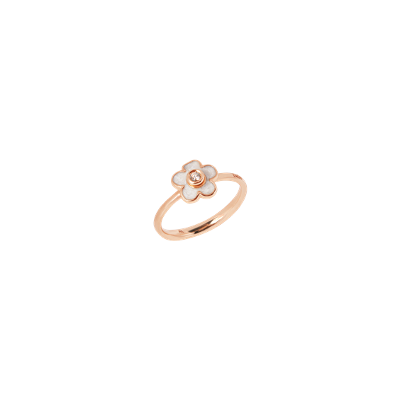 “Be positive, be grateful” La collezione Fiore lancia un nuovo messaggio. Il legame con la natura e la sua salvaguardia, assume ora un significato denso di gratitudine rivolta alla natura, che ad ogni stagione rinnova la sua bellezza. Anello fiore in oro rosa 9K, smalto effetto madreperla e 1 diamante bianco centrale (ct 0.03).