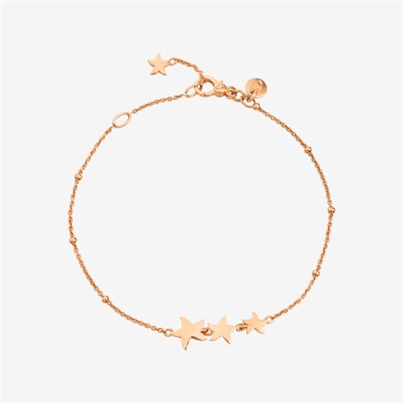 Bracciale in oro rosa 9K con 3 stelle. Una galassia di fascino, nella collezione Stellina… chi la trova è felice! Tra le profondità del mare e il sogno di un cielo stellato, esprimi un desiderio e scegli la tua stella in oro, diamanti o perle di cristallo. Infinite costellazioni in stile DoDo, da personalizzare per brillare sempre di luce propria.