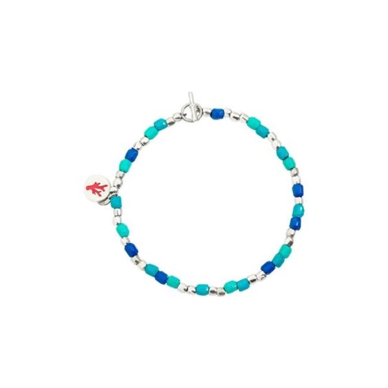 Argento, Plastica Riciclata, Acciaio. Bracciale mini granelli in plastica riciclata azzurra e argento 925, catena, anello brisé e piastrina in acciaio, t-bar in argento 925, pendente in argento e smalto rosso.