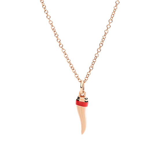 Le sue curve magiche attirano la fortuna, mentre la punta spazza via le vibrazioni negative. Un boost di energia positiva ispirato alla tradizione di Napoli, per chi sa che alla fortuna serve una piccola spinta. "Booster di fortuna" Ciondolo Cornetto in oro rosa 9K e smalto rosso.