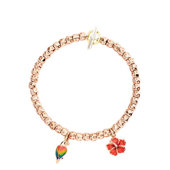 Una dichiarazione d'amore alla bellezza della natura tropicale il ciondolo Pappagallo in oro rosa 9 Ke smalto perlato posato a mano, con penne variopinte in multicolor. Ciondolo pappagallo in oro rosa 9K e smalto perlato multicolor.