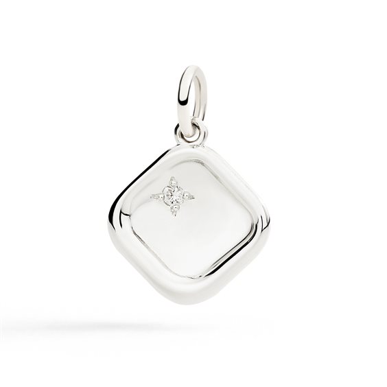 Ciondolo sigillo in argento 925 con 1 diamante bianco (ct 0,02). Il ciondolo Sigillo si presenta in due forme essenziali e simboliche: il quadrato e l’ovale. La versione in argento, quadrata, è impreziosita da un delicato accento di diamante. Pensato per essere indossato singolarmente o abbinato in composizioni originali e personali, il nuovo ciondolo dà vita a narrazioni sempre nuove, fluide e versatili, proprio come chi lo sceglie.