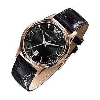 Orologio Emporio Armani uomo al quarzo con cassa in acciaio placcato oro rosa mm 39, quadrante nero, datario al 6, corona a pressione e fondo wr 5 atm. Cinturino in pelle nera e fibbia placcata oro rosa con logo ArmanI.