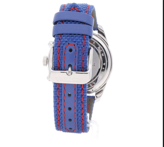 Orologio ragazzo , movimento cronografo al quarzo MJS20 , cassa in acciaio 316L , mm 36 , ghiera fissa , vetro minerale , quadrante blu con numeri e lancette bianchi , dettagli rossi , fondello a pressione , cinturino in pelle e tessuto blu con cuciture rosse