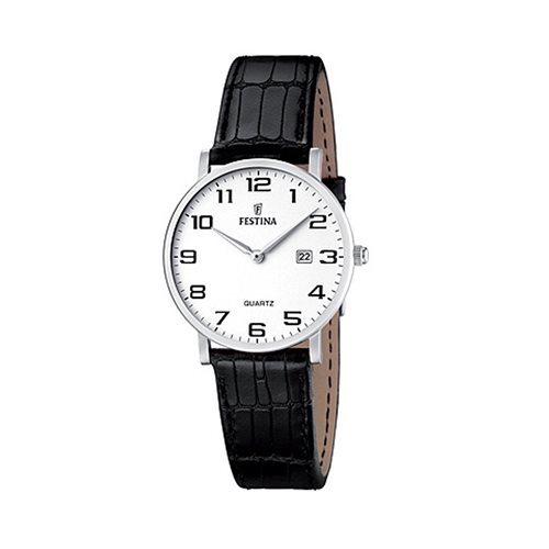 Orologio Festina. Cassa mm 30 in acciaio 316L, cinturino in pelle ero stampato, chiusura a fibbia. Quadrante bianco con numeri arabi neri stampati, datario al 3, lancette color acciaio. Movimento al quarzo, vetro minerale, fondello a pressione. Impermeabilità 3 atmosfere.