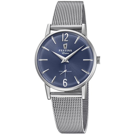 Orologio al quarzo, perfetta riproduzione del modello Extra del 1948; cassa e cinturino in acciaio inossidabile 316L. Quadrante blu con indici e sfere argento. Water-resistant 3 ATM