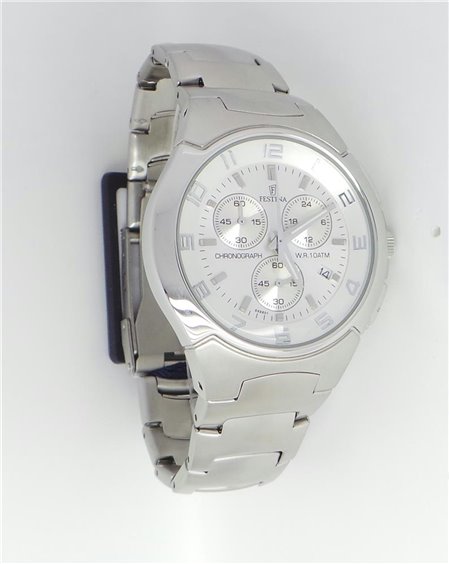Orologio cronografo al quarzo, water resistant 10 atm, cassa 40mm, spessore 10mm, quadrante silver con indici e numeri arabi, e cinturino in acciaio satinato 316L.