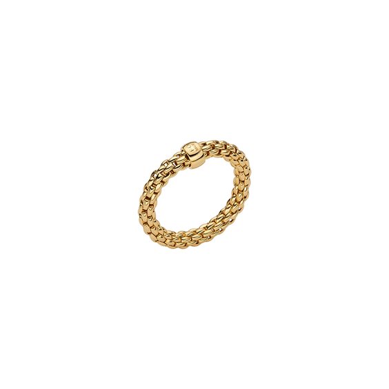 misura M (taglie dalla 14 alla 17) - Anello Fope Flex’it collezione Essential in Oro Giallo 18 carati, spessore di 3 mm. Al centro è presente una barra fissa in oro giallo con inciso il marchio Fope. Le maglie piatte dell'anello sono state sottoposte ad uno stress test di 12.000 trazioni per garantirne la qualità. Le maglie sono elastiche grazie alla tecnologia Flex’it brevettata Fope, con piccole molle in oro nascoste lungo la maglia.