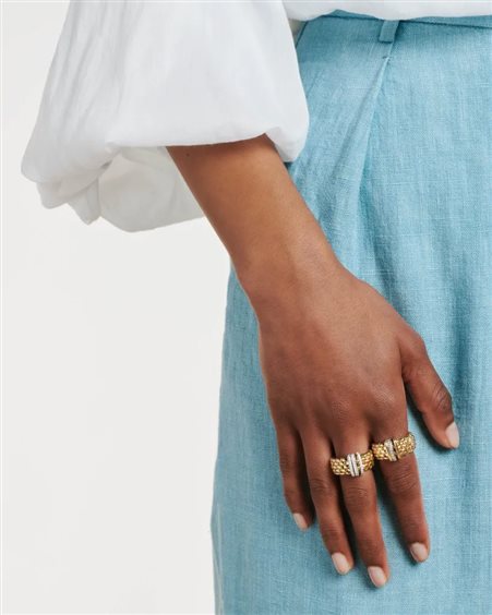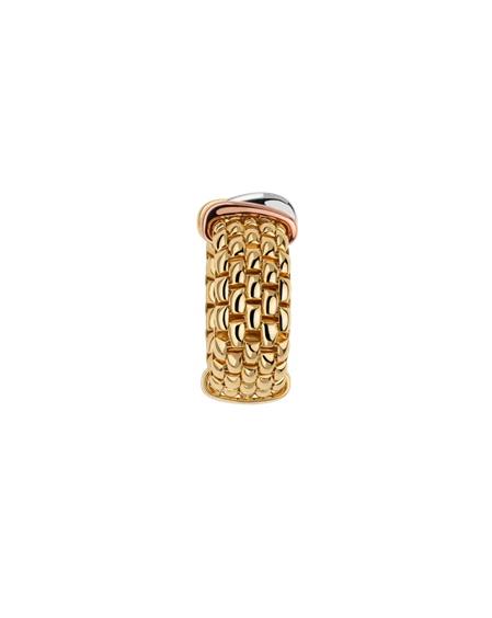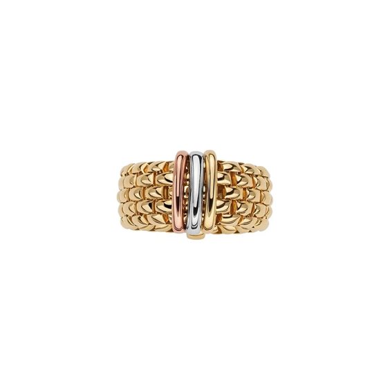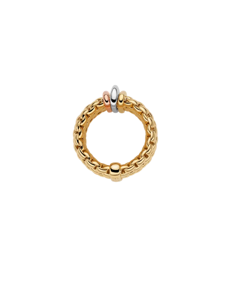 misura M (taglie dalla 14 alla 17) - Anello Fope Flex’it collezione Panorama in Oro Giallo,Oro Bianco e Oro Rosa 18 carati. Larghezza 10 mm, spessore 3,5 mm. Elemento centrale formato da tre anelli in oro giallo, rosa e bianco. Le maglie piatte dell'anello sono state sottoposte ad uno stress test di 12.000 prove per garantirne la qualità. Le maglie sono elastiche grazie alla tecnologia Flex’it brevettata Fope, con piccole molle in oro nascoste lungo la maglia che permettono di indossare l'anello in varie misure.