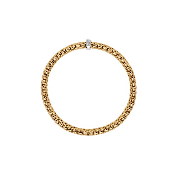 misura M (cm 17) - Bracciale Fope Flex’it collezione Vendôme, in Oro Giallo e Oro Bianco 18 carati. Elemento centrale formato da un anello in oro bianco impreziosito da diamanti bianchi per un totale di 0,10 carati. L’altezza del bracciale è di 6,50 mm, mentre lo spessore 4 mm. Le maglie piatte dell'anello sono state sottoposte ad uno stress test di 12.000 trazioni per garantirne la qualità. Le maglie sono elastiche grazie alla tecnologia Flex’it brevettata Fope, con piccole molle in oro nascoste lungo la maglia. Questo permette una vestibilità comoda e adattabile senza necessità di chiusure.