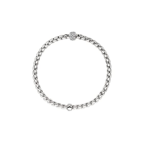 misura M (cm 17) - Bracciale Fope Flex’it collezione Eka, in Oro bianco 18 carati. Elemento centrale formato da un anello impreziosito da un pavé di diamanti bianchi per un totale di 0,19 carati. Lo spessore del bracciale è di 3,60 mm. Le maglie piatte dell'anello sono state sottoposte ad uno stress test di 12.000 trazioni per garantirne la qualità. Le maglie sono elastiche grazie alla tecnologia Flex’it brevettata Fope, con piccole molle in oro nascoste lungo la maglia. Questo permette una vestibilità comoda e adattabile senza necessità di chiusure.